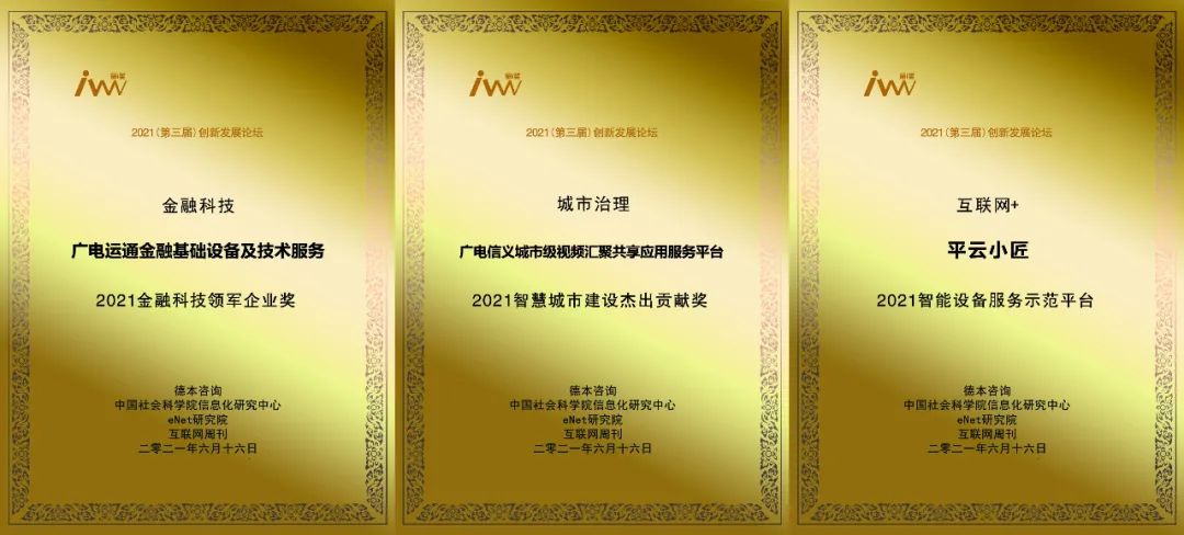 近日,由德本咨询、中国社会科学院信息化研究中心、eNet研究院、互联网周刊联合举办的2021(第三届)创新发展论坛在北京举行。会上公布了“创新型金i奖”的获奖名单,广电运通以卓越的金融基础设备及技术服务荣获金融科技行业“2021金融科技领军企业奖”;广电运通旗下子公司广电信义的城市级视频汇聚共享应用服务平台荣获城市治理行业“2021智慧城市建设杰出贡献奖”,平云小匠荣获“2021智能设备服务示范平台”荣誉称号。
