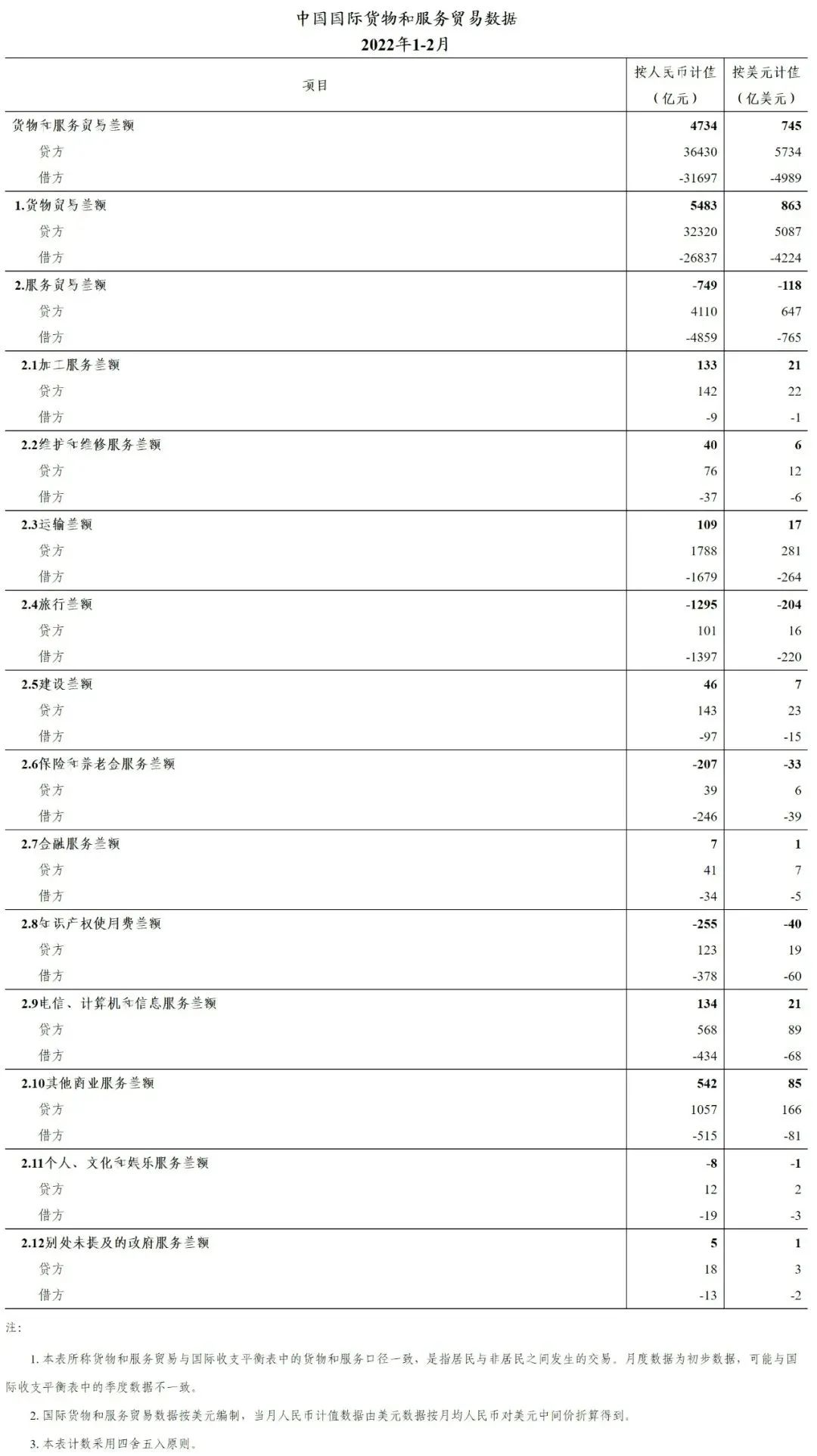 2022年1-2月我国国际货物和服务贸易数据