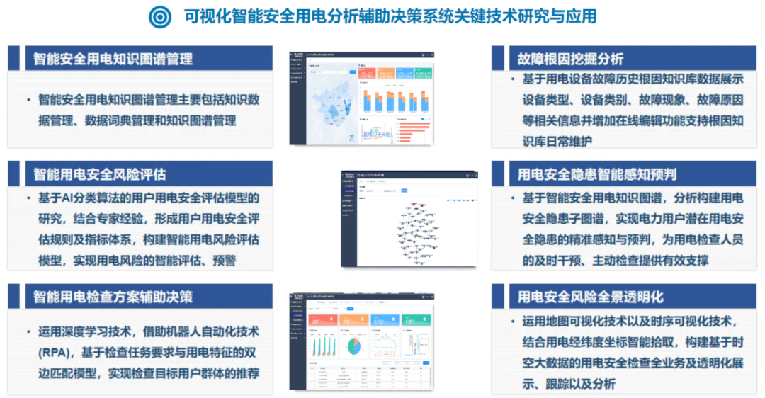 最后,研发可视化智能安全用电分析辅助决策系统,包含事故及隐患根因分析、客户风险动态评级、客户隐患清单智能生成、用检计划自动生成等功能。