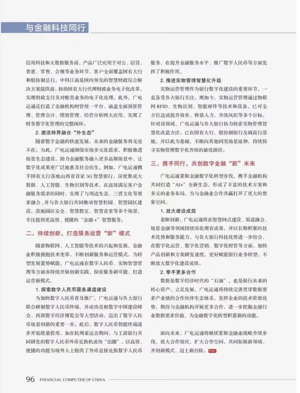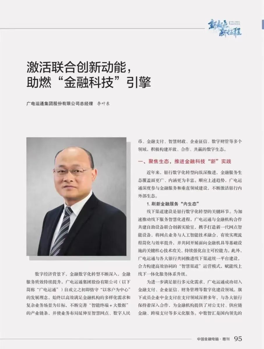 作为中国工商银行的重要合作伙伴,广电运通总经理李叶东受邀发表题为《激活联合创新动能,助燃“金融科技”引擎》的署名文章,回顾与金融业同频共振的发展之路,展示了与各大银行联合创新的丰硕成果。